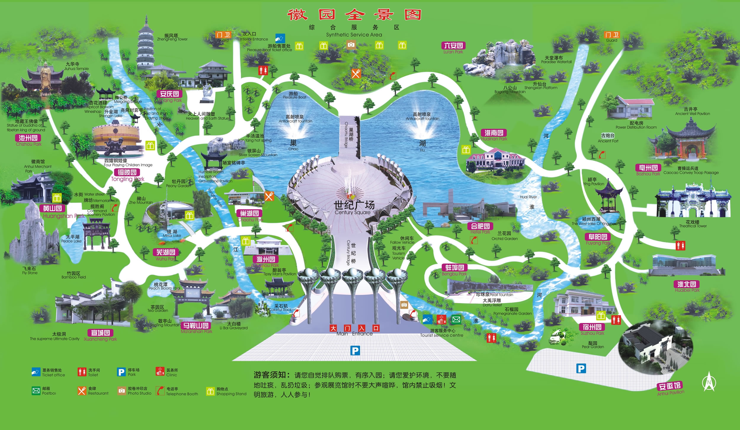 徽園,是中國第一個按一個省的版圖框架,采安徽民俗之靈氣,積安徽人文之精華,塑安徽風(fēng)物之神形。黃山之奇,九華之韻,天柱之秀,瑯琊之意,萬象皆備于一園。將安徽遠(yuǎn)古文明與現(xiàn)代文明、自然景觀與人文景觀凝縮于“方寸”之地,是安徽江淮大地的縮影,園區(qū)充滿徽風(fēng)皖韻。東部皖北園區(qū)采用皇家園林建筑風(fēng)格,西部皖南園區(qū)以徽派建筑水口園林為主要思路。中部是現(xiàn)代建筑風(fēng)格的世紀(jì)橋和世紀(jì)廣場。