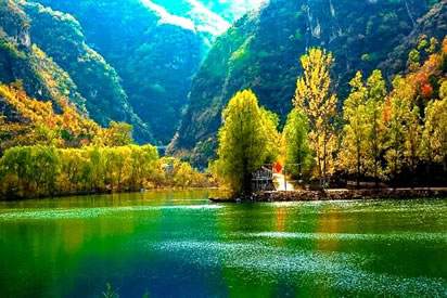 北京延慶烏龍峽谷景區(qū)——原名黑龍?zhí)丁N挥诤诤拥南掠,屬距?.4億年前的中生代火山熔巖區(qū),全長(zhǎng)2公里,是典型的山間河流深切河谷地貌景觀,峽谷兩側(cè)絕壁陡直、怪石林立,水聲轟鳴,浪花飛濺,以青山幽谷、碧水深潭遠(yuǎn)近聞名。這里,懸崖陡壁,潭澗相連,依次為四潭、三潭、二潭、頭潭;其中,頭潭較闊,四潭最深。每年豐水時(shí)節(jié),峽谷內(nèi)奔涌的河水從幾十米高的懸崖上飛瀉而下,激蕩于山澗巨石之間,但見浪濤擊石,銀花飛濺,雷鳴般的濤聲如群獅怒吼,煞是壯觀。