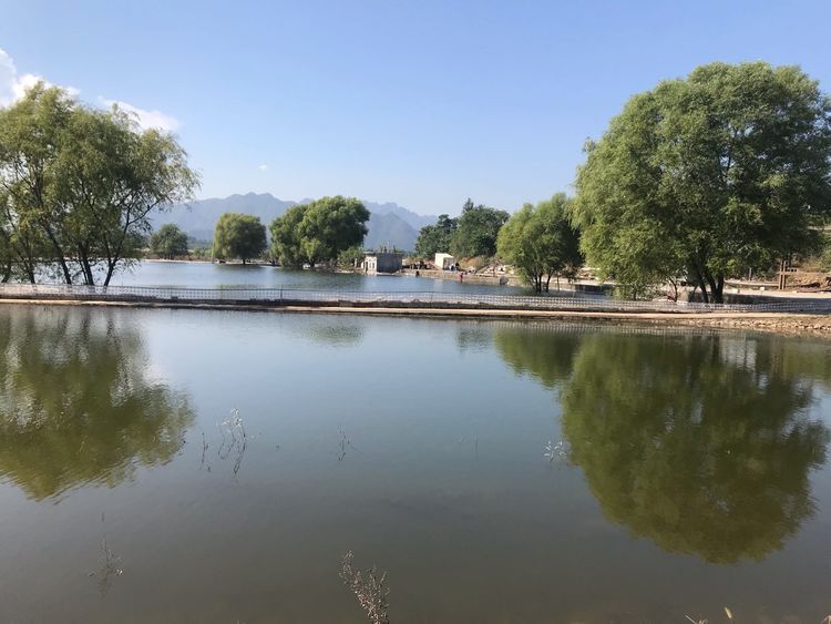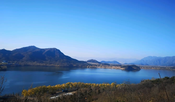 十三陵水庫 十三陵水庫位于北京市昌平區(qū)十三陵鎮(zhèn),水庫建于1958年。為山區(qū)盆地水庫,占地面積751公頃,其中陸地面積440公頃,水面311公頃。水庫四周群山矗立,兩岸有大片臺地、坡地,水面平穩(wěn),水深變化較小。水面受開闊度、水深和不同環(huán)境色彩影響,顯現(xiàn)出不同景觀效果。如在大壩附近,山高水深,水面倒映山影。而水庫上游,水面寬闊、岸坡平緩,視野開闊,在夕陽映照下,遠山連綿,近水蕩漾。那點綴在遠山近水之間的片片果林及點點皇陵,更增添了一層飄忽不定的朦朧色彩。