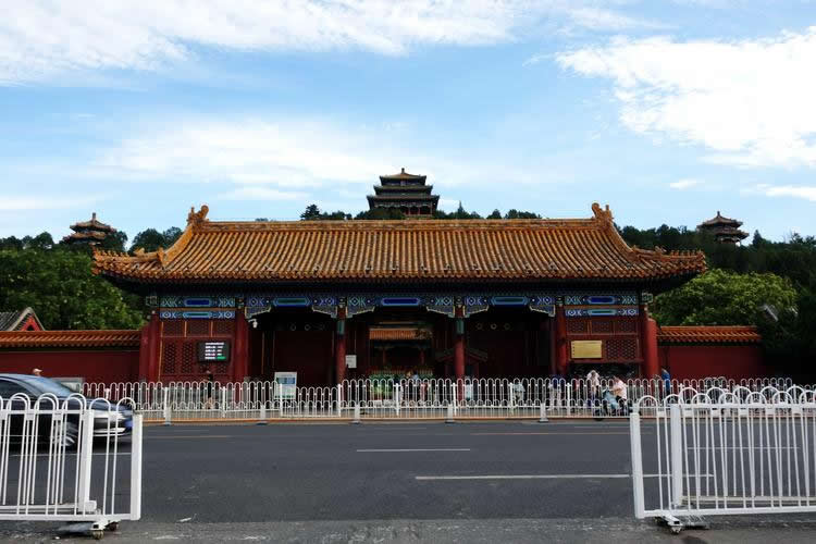 、倬吧介T。位于北京故城垣中軸線上,是公園的南門和正門。其南為故宮北門(神武門),其北為園內(nèi)綺望樓。坐北朝南。黃琉璃筒瓦歇山頂。面闊5間,進(jìn)深3間。單昂三踩斗拱,旋子彩畫。