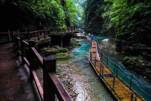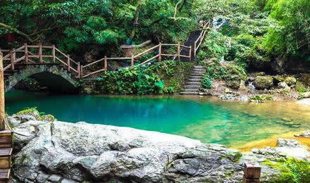 魚跳峽是黑山谷第三個峽谷,峽谷全長520米,該段峽谷曲折迂回,古木參天,蒼翠欲滴,飛瀑流泉隨處可見。每年春夏季節(jié),下游的紅尾鯉、青色鯽魚、紅尾高山鯰等魚類如果要進(jìn)入上游,必須由此彈跳越過落差達(dá)1米高的魚跳灘,峽谷因此而得名。