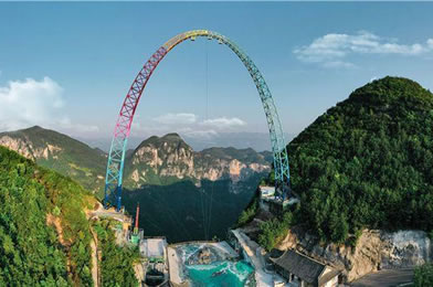 飛拉達(dá)是意大利文,是巖壁探險(xiǎn)或鐵道式攀登的音譯,指在山體巖壁上建設(shè)由鋼扶手、腳踏、生命鋼纜等構(gòu)成的攀登徑道。龍缸景區(qū)飛拉達(dá)位于標(biāo)識性景點(diǎn)云端廊橋左側(cè),距石筍河垂直高度700余米,攀登徑道全長600余米,主要由彩虹橋、鋼索、長空棧道、十二生肖秋千橋、空中圖騰柱、攀爬梯道組成,其中彩虹橋全長62米,因橋面板上繪制有不同色彩和風(fēng)景而得名。鋼索橋長約41米,由一根走繩、兩根扶繩組成,走繩非常細(xì)小,刺激驚險(xiǎn)。整個(gè)項(xiàng)目的錨固方式為采用化學(xué)錨栓錨固技術(shù)將鋼錨植入巖石1米多深,每一條鋼索的承重達(dá)到2噸左右。