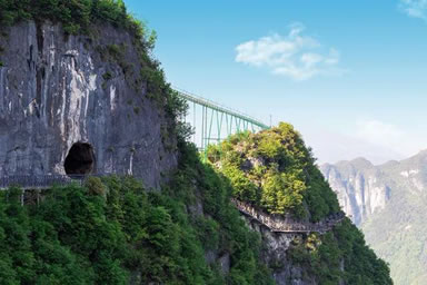 云端廊橋建在龍缸海拔1010米的絕壁之巔,懸挑長度26.68米,比美國科羅拉多大峽谷玻璃廊橋長5米多,位居世界第一。廊橋橋面、護(hù)欄采用全通透超白玻璃制作,可720度觀景。其造型設(shè)計(jì)、透視效果、驚險(xiǎn)刺激程度全球領(lǐng)先。廊橋上每年要舉行世界低空跳傘大賽,人們可在驚險(xiǎn)刺激的空中飄移中欣賞自然風(fēng)光。