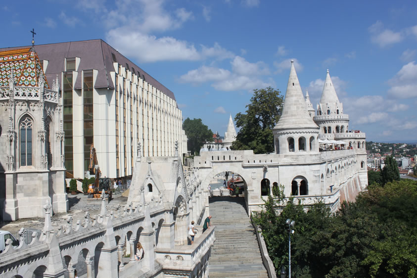 漁人堡 漁人堡(Halászbástya)是一個(gè)新哥特式和新羅曼風(fēng)格的觀景臺(tái),位于匈牙利首都布達(dá)佩斯布達(dá)一側(cè)多瑙河河畔的城堡山,鄰近馬加什教堂。它修建于1895年到1902年之間,設(shè)計(jì)師是弗里杰·舒勒克(Frigyes Schulek)。第二次世界大戰(zhàn)期間,漁人堡近乎毀滅。1947年至1948年之間,弗里杰·舒勒克的兒子亞諾什·舒勒克負(fù)責(zé)了修復(fù)工程。 如今,城堡的一部分作為餐廳使用;乩壤镉薪^佳的觀景角度,而瑪加什教堂與漁人城堡間的銅像,則是第一位匈牙利國圣·伊斯特萬一世,圣·史迪分國王雕像(King St. Stephen’s statue)圣·史迪分國王是匈牙利第一個(gè)天主教國王(公元1000年加冕),同時(shí)也可以說是匈牙利國的建立者。漁人堡旁的希爾頓旅館,外層是茶色的帷幕玻璃映照著漁人堡和一旁的教堂倒影,美麗而迷人。 從塔和觀景臺(tái),可以看到多瑙河、瑪格麗特島、東面的佩斯,以及蓋勒特丘陵(Gellért Hill)的全景。