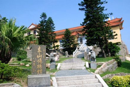 東山博物館,1988年6月開館,1995年3月建成三層樓新館,建筑面積986平方米,占地1400多平方米,館內(nèi)設(shè)有“文物室”、“閩臺史前文化關(guān)系陳列室”、“陳洪甄書畫室”、“東山建縣八十周年建設(shè)成就回顧展“等展室。展出舊石器時代、新石器時代以及歷代文物、圖片、拓片等700多件。其中有東山人“化石”,萬年前舊石器、各種動物(鹿、熊、象、犀牛、羊)化石,還有石器、銅器、陶瓷器、玉器、木雕、古今兵器、書畫、民俗文物及一艘從臺灣飄來的臺灣高山族獨木舟等。