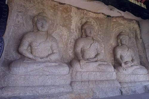 三世佛并排結(jié)咖跌坐于仰覆蓮花座上,主像通高約2.5米,左右二像稍低。佛像保存完好,皆為土蕃式樣:佛發(fā)螺鬢,上置寶嚴(yán)。面相上寬下窄,雙耳垂肩,肩寬腰細(xì),均著袒右肩袈,并以袈裟一角搭于左肩上。衣紋用凸雕線條表示,雖歷經(jīng)滄桑而線條依然明顯。石像均有圓形頭光及身光。中尊釋迦像,為現(xiàn)代佛,主管現(xiàn)代的世界,其造像作觸地印之魔相,一手向下?lián)岬,一手向上。左尊稱為藥師佛,即過(guò)去佛,主管過(guò)去的世界。他也是一手向下,一手向上,只是左掌托缽。右尊叫彌陀佛,是未來(lái)佛,作施定印之禪定相,即雙手交疊置于腹部。