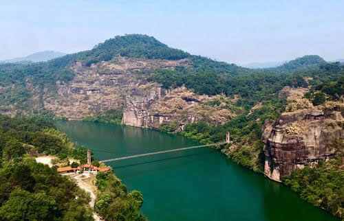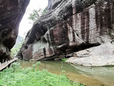 特殊地貌形成兩邊懸崖對峙,這條小澗叫桃花澗,從景區(qū)深處流出,我們的游路也將沿著高山峽谷的縫隙向內(nèi)延伸。桃源洞本沒有“洞”,無論是步行,還是泛舟游覽,都給人一種洞口的感覺右壁的懸崖高達120米,“桃源洞口”四個大字刻在36米高處,是明萬歷年間,辭官回永安的名士陳源湛于1605年所題,每字兩米見方。