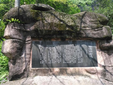 這塊巖石平整如盤。相傳,仙人常降臨這里對弈下棋。巖壁上刻的這兩個篆體字叫“奕臺”!稗呐_”邊上這搖搖欲墜的石頭,風(fēng)吹石動,名曰:“飛來石”。巖壁上還有摩崖石刻“化極磐”三個字,帶有佛教語的味道,意思是:進入幻想中的靈變超脫境界。