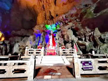瑤池玉女: 高處懸掛著一盞巨大的宮燈,燈下是一塊巨石,石邊上立著一片長條條、孤零零的石筍。繞到下方仰望,石頭斜傾,玉女剎那間變成在大風(fēng)大浪中奮力劃船的漁家婦女。還有人說是莫愁女、是率眾仙渡海的觀音、是日本姑娘等。