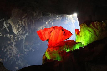 自藏禾洞沿石階而上,便到了雷公洞。洞內(nèi)石筍和石鐘乳十分發(fā)達(dá),因巖石含有碳酸鈣、鐵質(zhì)、方解石、石英等成分,整個洞廳色彩斑斕。洞底暗河水聲隆隆,猶如雷鳴,故而得名。傳說天上雷神每年都要下來巡洞一次,在這里休息。