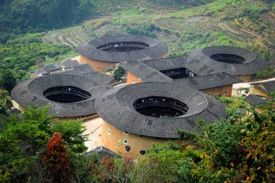 福建土樓產(chǎn)生于宋元,成熟于明末、清代和民國時(shí)期。土樓以石為基,以生土為主要原料,分層交錯(cuò)夯筑,配上竹木作墻骨牽拉,丁字交叉處則用木定型錨固。福建土樓或方或圓,以圓為主,如珍珠般灑落在閩西南的綠水青山間。福建土樓遵循了“天人合一”的東方哲學(xué)理念,就地取材,選址或依山就勢(shì)、或沿循溪流,建筑風(fēng)格古樸粗獷,形式優(yōu)美奇特,尺度適當(dāng),功能齊全實(shí)用,與青山、綠水、田園風(fēng)光相得益彰,組成了適宜的人居環(huán)境以及人與自然和諧統(tǒng)一的景觀。