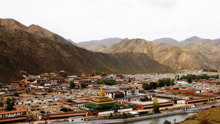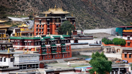 寺院坐北向南,占地總面積86.6萬平方米,建筑面積40余萬平方米,主要殿宇90多座,包括六大學(xué)院、16處佛殿、18處昂欠(大活佛宮。、僧舍及講經(jīng)壇、法苑、印經(jīng)院、佛塔等,形成了一組具有藏族特色的宏偉建筑群,房屋不下萬間。