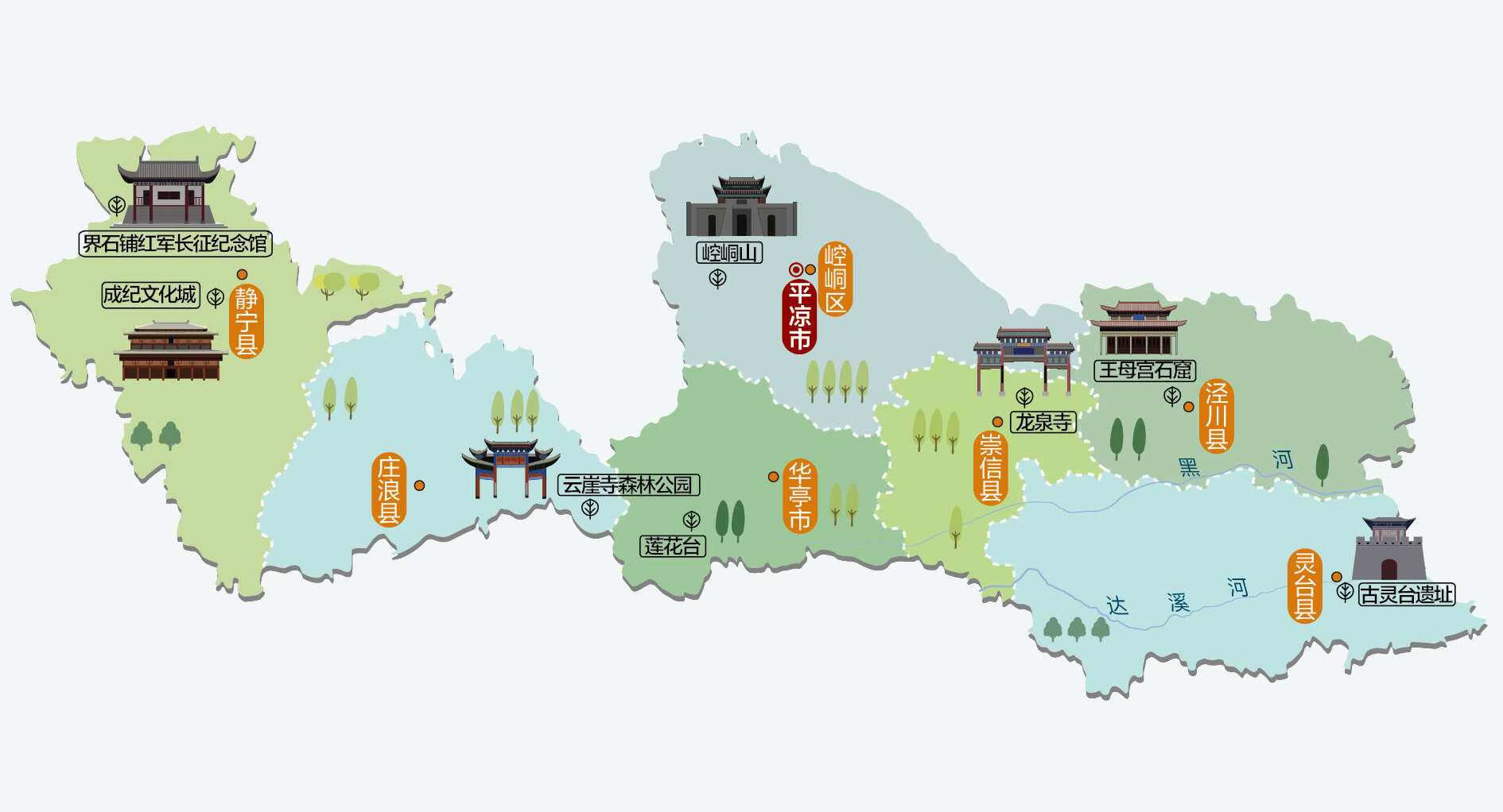 平?jīng)鍪休?個區(qū)、5個縣,代管1個縣級市:
