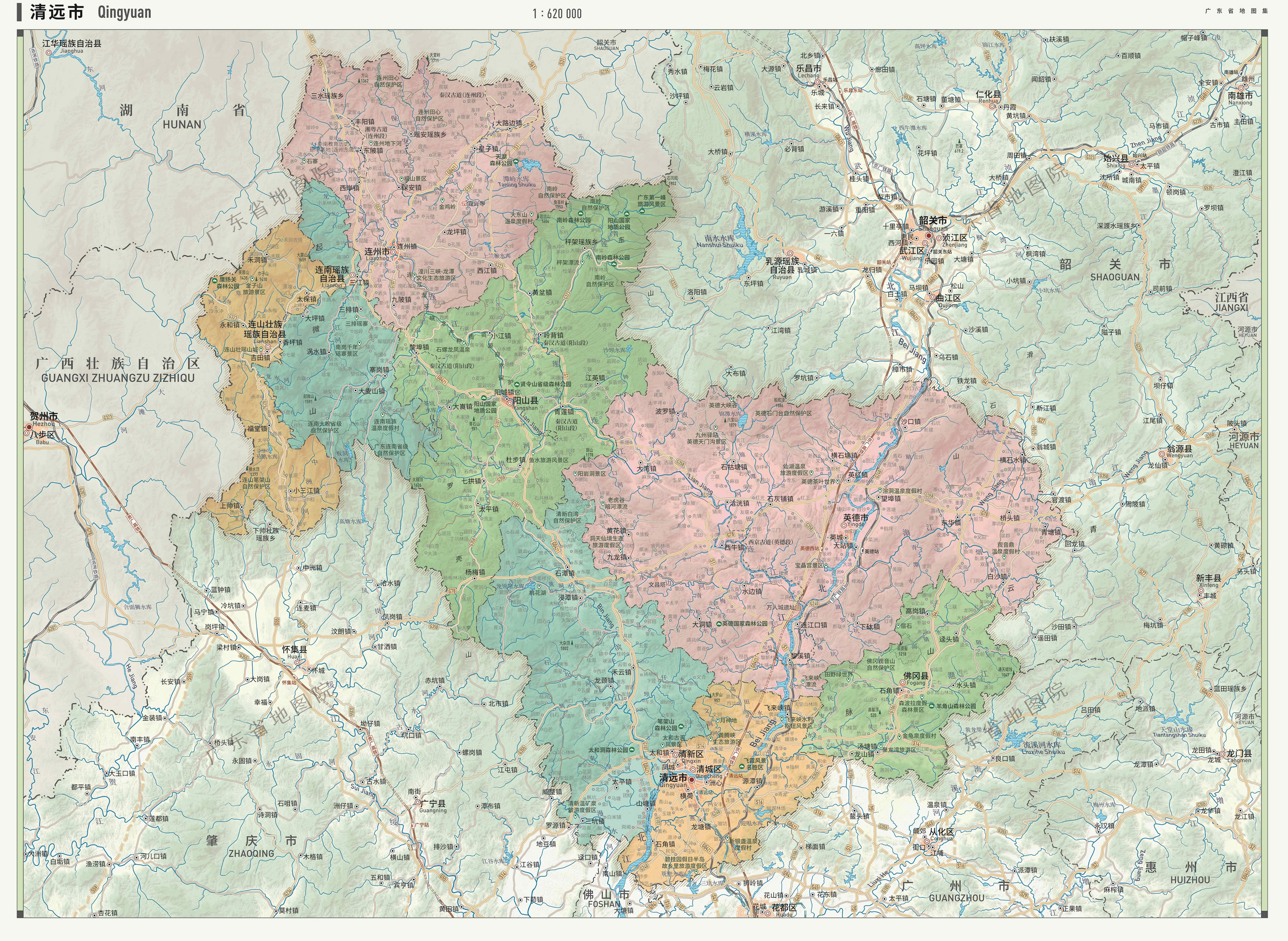 清遠(yuǎn)市轄2個(gè)市轄區(qū)、2個(gè)縣、2個(gè)自治縣,代管2個(gè)縣級市: