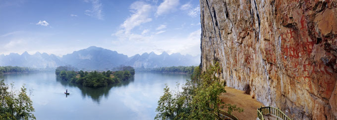 位于縣城西北25千米的明河畔,以其古老神奇的巖畫(huà)而聞名中外;ㄉ綆r畫(huà)是左江流域巖畫(huà)中的代表,也是世界同類巖畫(huà)中單位面積最大、畫(huà)面最集中、內(nèi)容最豐富、保存最完好的一處巖畫(huà),被譽(yù)為是壯族文化的瑰寶。 1988年,花山巖畫(huà)被國(guó)務(wù)院列為全國(guó)重點(diǎn)文物保護(hù)單位。1998年,以花山巖畫(huà)為中心的花山風(fēng)景區(qū)被定為國(guó)家級(jí)風(fēng)景旅游名勝區(qū),成為與桂林漓江、桂平西山齊名的廣西三大國(guó)家級(jí)風(fēng)景旅游名勝區(qū)之一。2000年開(kāi)始,國(guó)家文物局實(shí)施花山巖畫(huà)保護(hù)計(jì)劃,對(duì)保護(hù)巖畫(huà)進(jìn)行深入研究。2003年6月,寧明縣啟動(dòng)花山巖畫(huà)申遺工作。2004年11月,國(guó)家建設(shè)部把寧明縣花山巖畫(huà)列入《中國(guó)申報(bào)世界遺產(chǎn)預(yù)備名單》。