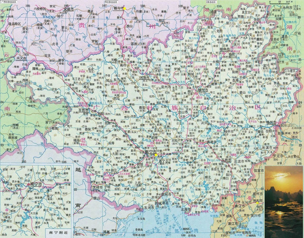廣西河流眾多,清澈娟秀,在地域上多與奇峰相配,形成一派山環(huán)水繞,山水相依的秀麗景色。除舉世聞名的漓江外,景色優(yōu)美的還有融水的貝江、資源的資江、宜山的下規(guī)河、大新的黑水河、崇左的左江、寧明的明江等。湖泊風景多以較大的湖泊或水面為主景,湖岸的山丘、原野和農(nóng)家村舍、田園風光或城市風貌等為襯景而組成。如桂林的榕湖、杉湖,南寧的南湖,柳州的龍?zhí),貴港的東湖,陸川的龍珠湖等。此外,廣西還有不少水質優(yōu)良、水面寬闊、群山環(huán)抱、湖光山色十分秀美的水庫,如靈川青獅潭、百色澄碧河、富川龜石、邕寧大王灘、合浦洪湖江、玉林寒山等水庫。