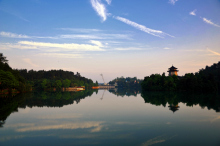 靈湖是一個自然湖泊,素有小西湖之美譽,湖面寬780畝,其最深的地方可達30米。其水來自廣西靈川縣海洋鄉(xiāng)的海洋河。水質清澈冰涼,四周青松翠柏倒影湖中,猶如一幅淡淡的山水潑墨畫!八鉃囦偾绶胶,山色空蒙雨亦奇”