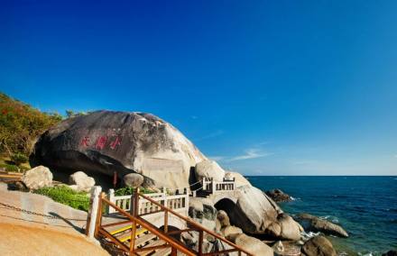 天涯海角位于天涯區(qū)的馬嶺山腳下,距三亞市區(qū)約26千米。其前海后山,風(fēng)景獨特。步入游覽區(qū),沙灘上那一對拔地而起的高10多米,長60多米的青灰色巨石赫然入目。兩石分別刻有“天涯”和“海角”字樣,意為天之邊緣,海之盡頭。“天涯海角”就是由此得名的。