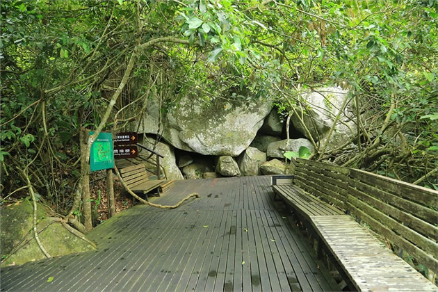 雨林谷的吉祥梯步向上走可見如同巨傘、渾身掛滿紅布條和小木牌的大榕樹,高約四十米,樹齡超過一千年,根系將中間的石頭團(tuán)團(tuán)抱住。樹下長著眾多的莆葵和海芋,都被大榕樹伸出的枝條“攬”在懷中,當(dāng)?shù)厝朔Q其為“峒主神樹”。