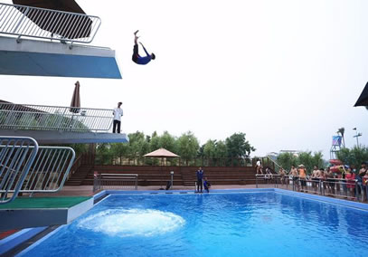 新增項(xiàng)目: 高空氣泡跳水。景區(qū)引進(jìn)德國的凈水裝置和氣泡裝置,通過氣泡裝置降低水密度,減少入水時游客承受的壓力,降低安全風(fēng)險,設(shè)置了距離水面1m、3m、5m三種高度的跳臺。