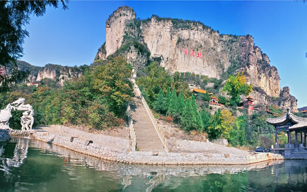 抱犢寨風(fēng)景名勝區(qū)是國(guó)家AAAA景區(qū),位于河北省石家莊市鹿泉市境內(nèi),距石家莊市16公里,距首都北京288公里。抱犢寨,舊名抱犢山,古名萆山,是一外集歷史人文和自然風(fēng)光為一體的名山古寨。它東臨華北平原,西接太行群巒,一峰突起,崢嶸雄秀,四周皆是懸崖絕壁,遠(yuǎn)望猶如巨佛仰臥,眉目畢肖。山頂平曠坦夷,有良田沃土660畝,土層深達(dá)66米,異境別開,草木繁茂,恍如世外桃源。有“天下奇寨”、“抱犢福地”、“全國(guó)最大山頂園林”等美譽(yù)。其景點(diǎn)均集中在寨頂平臺(tái)之上,有全國(guó)最大的山頂門坊南天門、道教宮觀金闕宮、全國(guó)最大的山頂?shù)叵率裎灏倭_漢堂、華夏第一龍壁千龍壁以及牛郎織女故事的發(fā)祥地——牛郎織女家、天池、天堂街、環(huán)山長(zhǎng)城等諸多景點(diǎn);公元前204年漢將韓信曾于此萆山設(shè)伏、背水一戰(zhàn)、大破趙軍,因而寨頂建有韓信點(diǎn)將臺(tái)和韓信祠。金末元初,金恒山公武仙曾于此山屯兵建寨,抗擊蒙古軍隊(duì)。在道教典籍中,該山被列為“北岳佐命”,明代著名道士張三豐也曾游歷此山,留下了“三豐派”一支脈,至今相傳不絕,宮觀猶存。近年來,景區(qū)大力實(shí)施升級(jí)改造工程,重修了登山路;開發(fā)建設(shè)了以音樂噴泉、讀月臺(tái)、天井飛瀑、彩虹谷、思凡亭等景點(diǎn)為主的鹿隱源生態(tài)新區(qū)。并增加了具有鮮明特色的少數(shù)民族歌舞演出,景區(qū)魅力倍增。