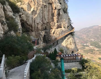 天梯山系太行山脈,海拔雖說只有500多米,但山不在高,奇特則名。遠看此山平平常常貌不驚人,近前才知與眾不同確有奇特之處。說其奇,奇就奇在該山古洞群聚,洞套洞洞連洞別有洞天;說其特,特就特在該山怪石嶙峋形貌各異,壁立千仞宛若刀劈,登山臺階陡立向上,好像一架梯子高倚云天,其險要之勢,奇特之狀令人交口贊絕。
