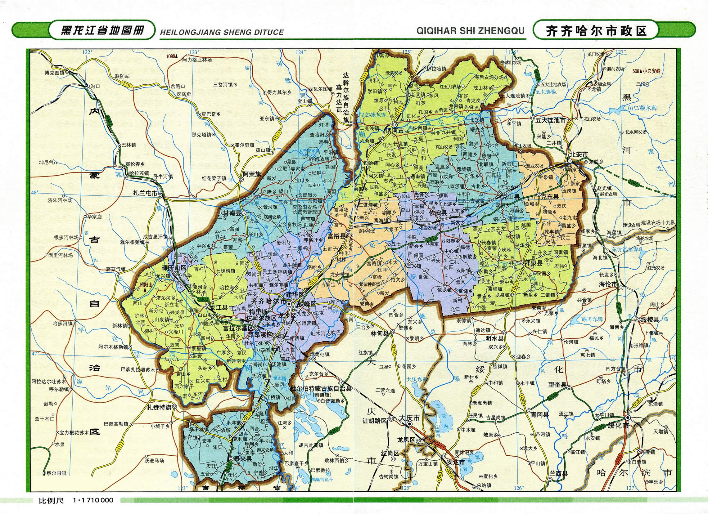 齊齊哈爾市轄7個(gè)市轄區(qū)、8個(gè)縣,代管1個(gè)縣級(jí)市: