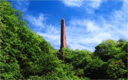 天碑高達(dá)50余米,是一個(gè)巨型崩塌巖塊。由于崩塌時(shí)的位移,原來(lái)近水平產(chǎn)出的巖層此時(shí)呈直立狀,巍然聳峙在峽谷一側(cè),高大雄偉、氣勢(shì)恢弘,一景多變,步移景換,從不同角度仰望,或蒼鷹、或飛鳥(niǎo)、或飛魚(yú)、或刀背、或天碑,大自然賦予其無(wú)限美感。傳說(shuō),這本是二郎神斬殺小白龍的大刀,圣母媧皇在安置了小白龍神位之后,又把二郎神丟下的大刀豎立起來(lái),刀背對(duì)著無(wú)頭冤神洞,于是二郎神斬殺小白龍的大刀,成了紀(jì)念小白龍的無(wú)字碑,人們稱其為“擎天刀碑石”。