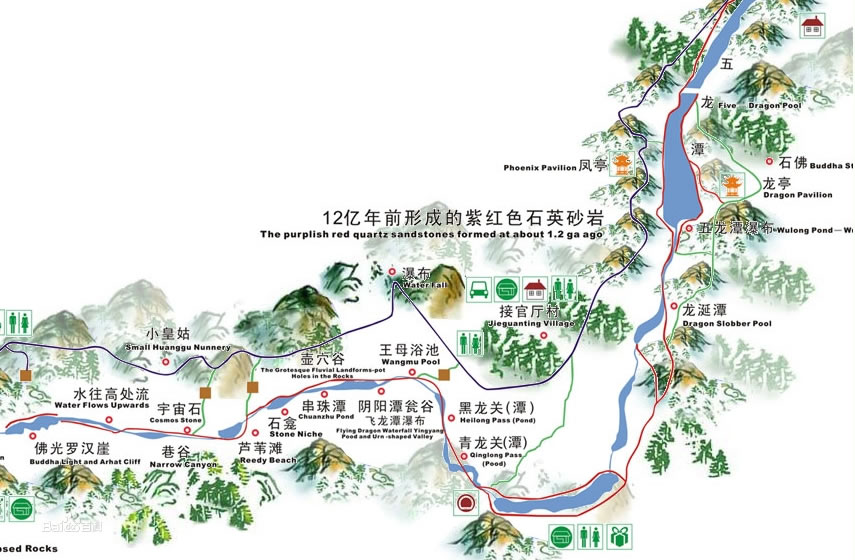 紅巖絕壁,飛瀑幽潭,狹溝深谷,奇石綠蔭,組成世界上罕見(jiàn)的山水畫(huà)廊。