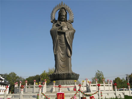 觀音菩薩為雙面造型,黃銅鑄造,周圍是漢白玉欄桿,像高18.8米,立于一個3米高的蓮臺之上,重達20噸,雙面觀音為二臂正觀音基本形,也稱為圣觀音像。