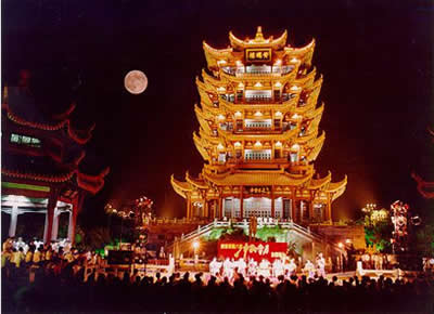 號(hào)稱(chēng)江南三大名樓之一的黃鶴樓,原址在湖北武昌蛇山黃鶴磯頭,原為辛氏開(kāi)設(shè)的酒店,一道士為了感謝她千杯之恩,臨行前在壁上畫(huà)了一只鶴,告之它能下來(lái)起舞助興。從此賓客盈門(mén),生意興隆。過(guò)了十年,道士復(fù)來(lái),取笛