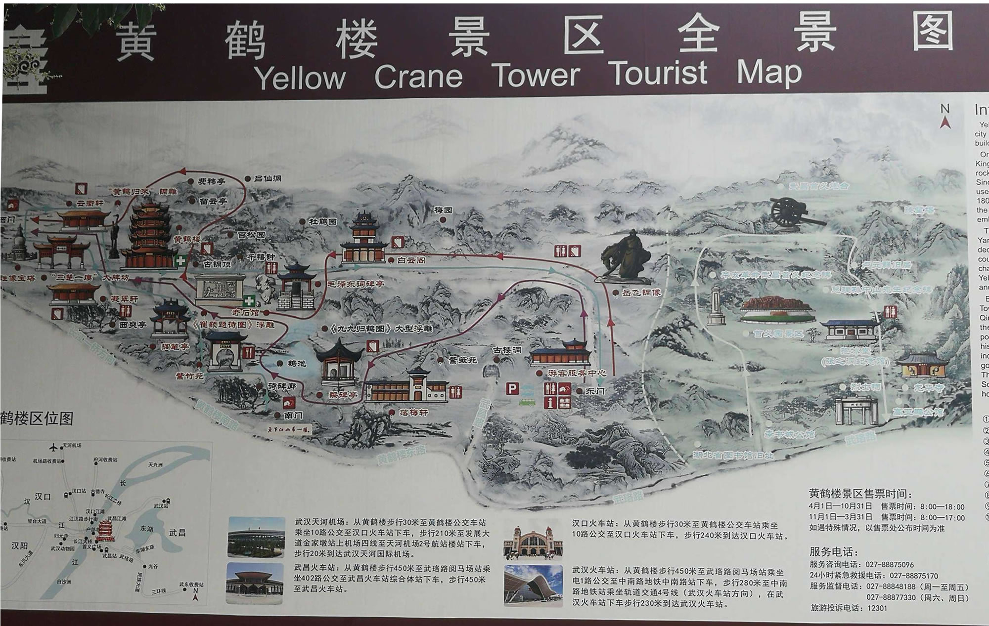 塔、碑廊、山門(mén)等建筑。整個(gè)建筑具有獨(dú)特的民族風(fēng)格。黃鶴樓內(nèi)部,層層風(fēng)格不相同。底層為一高大寬敞的大廳,其正中藻井高達(dá)10多米,正面壁上為一幅巨大的“白云黃鶴”陶瓷壁畫(huà),兩旁立柱上懸掛著長(zhǎng)達(dá)7米的楹聯(lián):爽氣西來(lái),云霧掃開(kāi)天地撼;大江東去,波濤洗凈古今愁。二樓大廳正面墻上,有用大理石鐫刻的唐代閻伯瑾撰寫(xiě)的《黃鶴樓記》,它記述了黃鶴樓興廢沿革和名人軼事;樓記兩側(cè)為兩幅壁畫(huà),一幅是“孫權(quán)筑城”,形象地說(shuō)明黃鶴樓和武昌城相繼誕生的歷史;另一幅是“周瑜設(shè)宴”,反映三國(guó)名人去黃鶴樓的活動(dòng)。三樓大廳的壁畫(huà)為唐宋名人的“繡像畫(huà)”,如崔顥、李白、白居易等,也摘錄了他們吟詠黃鶴樓的名句。四樓大廳用屏風(fēng)分割幾個(gè)小廳,內(nèi)置當(dāng)代名人字畫(huà),供游客欣賞、選購(gòu)。頂層大廳有《長(zhǎng)江萬(wàn)里圖》等長(zhǎng)卷、壁畫(huà)!