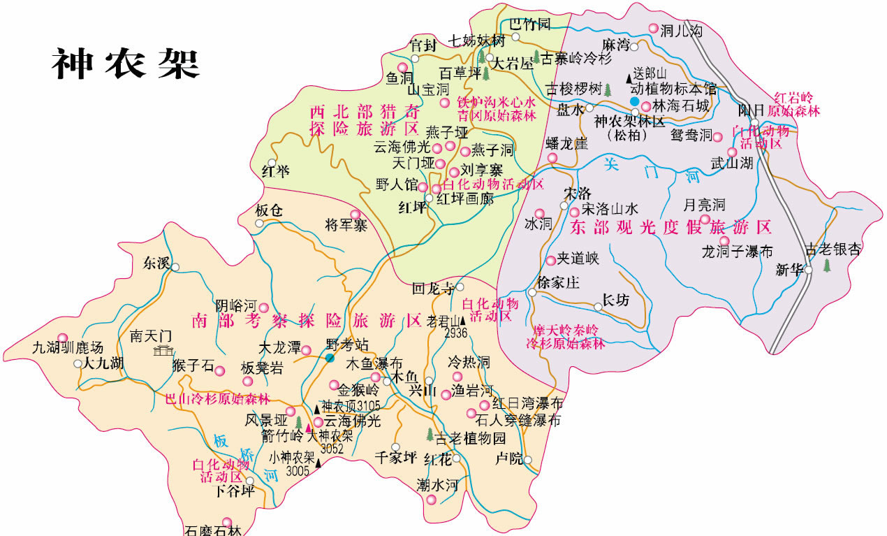 神農(nóng)架是我國內(nèi)陸保存完好的唯一一片綠洲和世界中緯度地區(qū)唯一的一塊綠色寶地。它所擁有的在當(dāng)今世界中緯度地區(qū)唯一保持完好的亞熱帶森林生態(tài)系統(tǒng),是最富特色的壟斷性的世界級(jí)旅游資源,動(dòng)植物區(qū)系成分豐富多彩,古老、特有而且珍稀。蒼勁挺拔的冷杉、古樸郁香的巖柏、雍容華貴的梭羅、風(fēng)度翩翩的珙桐、獨(dú)占一方的鐵堅(jiān)杉,枝繁葉茂,遮天蔽日;金絲猴、白熊、蘇門羚、大鯢以及白鸛、白鶴、金雕等走獸飛禽出沒草叢,翔天林間。一切是那樣地和諧寧靜,自在安詳。這里還有著優(yōu)美而古老的傳說和古樸而神秘的民風(fēng)民俗,人與自然其同構(gòu)成我國內(nèi)地的高山原始生態(tài)文化圈。神農(nóng)氏嘗草采藥的傳說、“野人”之謎、漢民族神話史詩《黑暗傳》、川鄂古鹽道、土家婚俗、山鄉(xiāng)情韻都具有令人神往的誘惑力。這里山峰瑰麗,清泉甘冽,風(fēng)景絕妙。神農(nóng)頂雄踞“華中第一峰”,風(fēng)景埡名躋“神農(nóng)第一景”;紅坪峽谷、關(guān)門河峽谷、夾道河峽谷、野馬河峽谷雄偉壯觀;陰峪河、沿渡河、香溪河、大九湖風(fēng)光綺麗;萬燕棲息的燕子洞、時(shí)冷時(shí)熱的冷熱洞、盛夏冰封的冰洞、一天三潮的潮水洞、雷響出魚的錢魚洞令人叫絕;流泉飛瀑、云海佛光皆為大觀!