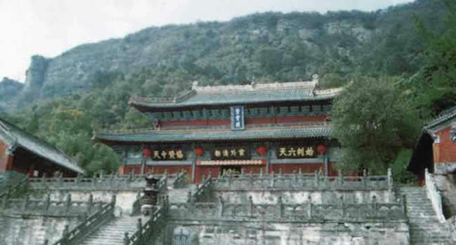 紫霄宮:建于明永樂十一年(公元1413年),原建宮殿、廊廡、齋堂、亭臺(tái)等860多間,賜額“太元紫霄 宮”。紫霄宮背依展旗峰;面對(duì)照壁、三臺(tái)、五老、蠟燭、落帽、香爐諸峰;右為雷神洞;左為禹跡池、寶珠峰。周圍山巒天然形成一把二龍戲珠的寶椅,明永樂皇帝封之為“紫霄福地”。