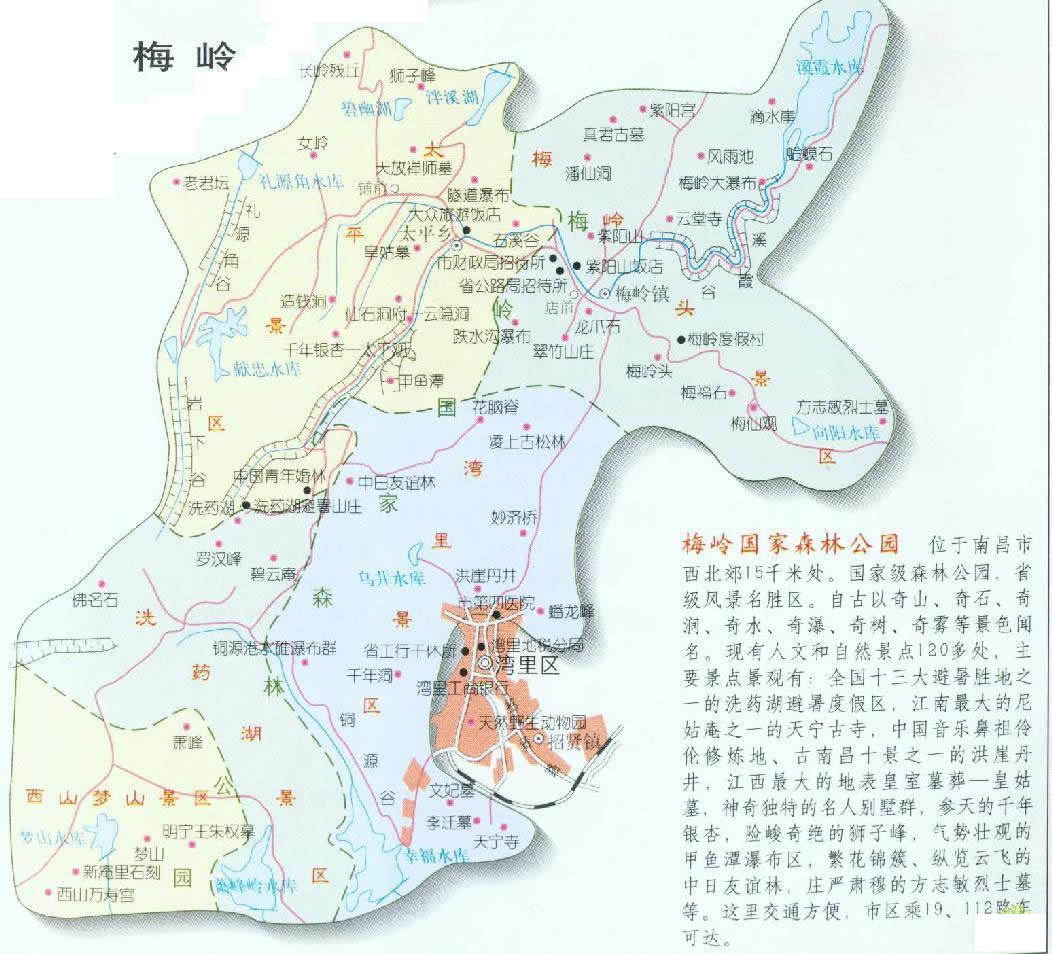 梅嶺風(fēng)景名勝區(qū)位于南昌市西郊15公里處,在江南最大的“飛來(lái)峰”上,因西漢梅福于此修道而得名。又因位于城區(qū)之西,復(fù)又名西山。梅嶺西臨鄱陽(yáng)湖,北與廬山對(duì)峙,方圓150平方公里,是著名的避暑勝地,也是中國(guó)古典音律和道教凈明宗的發(fā)源地。