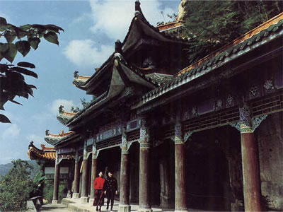由一級高臺拾級而上,即達二級高臺(象征城墻的臺座)。這兩級高臺共有89級臺階,而新閣恰于1989年落成開放。二級高臺的墻體及地坪,均為江西峽江縣所產(chǎn)花崗石。高臺的四周,為按宋代式樣打鑿而成的花崗石欄桿,古樸厚重,與瑰麗的主閣形成鮮明的對比。