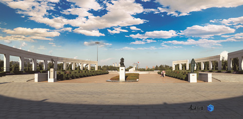 規(guī)劃采用中國傳統(tǒng)與西方造園學(xué)說和現(xiàn)代規(guī)劃理念相結(jié)合的構(gòu)思,達(dá)到了自然與人文的和諧統(tǒng)一,主入口大門及兩側(cè)弧形引導(dǎo)墻,沿中軸線對(duì)稱布局相得益彰;不對(duì)稱的景觀廣場,運(yùn)用巧妙的軸線轉(zhuǎn)折,通過拱形橋與主題雕塑遙相呼應(yīng)。