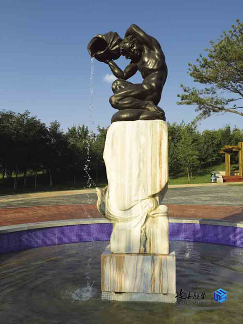 米開朗基羅廣場位于長春世界雕塑公園北入口處,由“水瓶時(shí)代替代金魚時(shí)代”、“山川流水”、“騎熊的女孩”、“樂迷”與“都市言情”5件(組)作品構(gòu)成。廣場呈三角形,“水瓶時(shí)代替代金魚時(shí)代”居中,是俄羅斯雕塑家亞歷山大?維諾格拉托夫的作品,寓示了時(shí)間的更替和輪回,與其他作品共同形成一個(gè)很具歐洲風(fēng)格的視覺效果。廣場東側(cè)設(shè)置了供游人休息的木質(zhì)涼亭,與“樂迷”、“都市言情”所表達(dá)的情調(diào)相輝映。