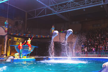 2、《海豚灣之戀》表演——圣亞“三大表演”之一,海豚、白鯨、美人魚、王子、海盜、月光天使共同主演,情節(jié)跌宕起伏,風(fēng)格浪漫唯美。表演地點(diǎn):夢幻海豚灣。表演時(shí)長:20分鐘左右(旺季表演前10分鐘有外國小丑互動(dòng))。