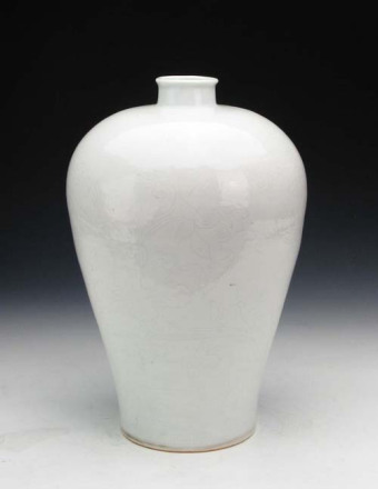 明永樂白釉暗串枝蓮花梅瓶:小口,圓唇,短頸,豐肩。器物紋飾為劃花,器物肩部上下各兩道弦紋,中間為靈芝纏枝花紋,八顆靈芝首尾相接,纏枝不斷。腹部兩組大荷葉蓮花,每組為三朵蓮花并蒂爭相開放,神態(tài)各異。此瓶為明永樂時(shí)期景德鎮(zhèn)官窯器,甜白釉,白中閃青。釉色白瑩,光亮潤澤,胎質(zhì)細(xì)潔,整個(gè)器物造型規(guī)矩。肩部圓潤略顯豐滿。底足為平底。