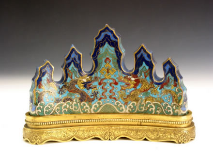 乾隆款掐絲琺瑯海水雙龍筆架:筆架整體呈弧形山巒狀,五組山峰聳立,峰與峰之間壑谷可做承筆之用。山體采用掐絲琺瑯工藝制成,以深藍(lán)、淺藍(lán)、綠色、純藍(lán)等色為地,使山峰更具層次感;峰下飾有金黃色行龍,龍首之間為金黃色萬字紋,龍身下方飾有綠色海水紋。筆架之下為弧形鎏金底座,鏨刻一圈珍珠紋,其下為束腰式,再下面鏨刻卷草紋,座底為如意云紋足,底部中央鏨刻陰文楷書“乾隆年制”4字款。