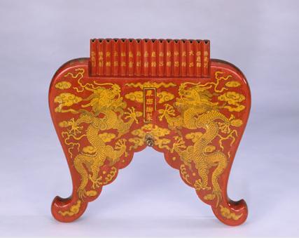 清乾隆款朱漆描金云龍紋排簫:通體遍涂朱紅彩漆,大部分為木制,刻成獸腿開叉形狀,腿下部雕成云頭形狀。雙面均描金繪二龍戲珠、浮云、火焰圖案,在正面火焰珠位置為長條方池,內(nèi)有金漆楷書“乾隆八年制”年款。排簫上部為單排十六根竹管,用于吹奏之用,管上正面各以金漆書寫楷書律名,從左至右依序?yàn)椤氨兑膭t”“倍無射”“黃鐘”“太簇”“姑洗”“蕤賓”“夷則”“無射”“應(yīng)鐘”“南呂”“林鐘”“仲呂”“夾鐘”“大呂”“倍應(yīng)鐘”“倍南呂”。排簫底部系有一條五彩流蘇。