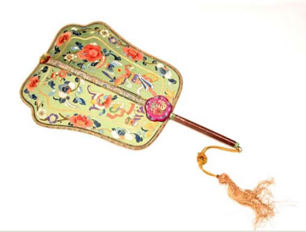 清紅木柄綠緞彩繡博古紋扇:此扇為多弧邊長方形,扇頂微向后彎曲,扇面為綠色緞制,滿繡五彩花卉、博古紋飾,另有金錢壓紋邊,扇中骨及邊緣均用彩繡錦邊制成。扇面與柄桿交接處有紅緞五瓣梅花形裝飾,花內(nèi)繡有佛手、瓜、桃及五蝶圖案。扇柄為紅木制成,刻有花卉紋,柄兩頭鑲有綠色骨飾。柄頭系黃色絲穗。