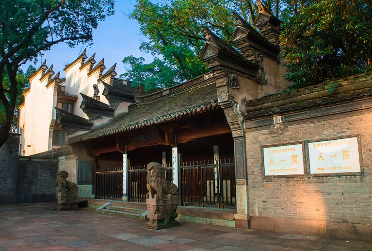 天一閣,位于浙江省寧波市海曙區(qū),建于明嘉靖四十年至四十五年(1561年—1566年),由當時退隱的明朝兵部右侍郎范欽主持建造,占地面積2.6萬平方米,已有400多年的歷史。天一閣藏書樓坐北朝南,為兩層磚木結(jié)構(gòu)的硬山頂重樓式建筑,通高8.5米,斜坡屋頂,青瓦覆上。一層面闊、進深各六間,二層除樓梯間外為一大通間,以書櫥間隔。閣前鑿“天一池”通月湖,園林以“福、祿、壽”作總體造型,用山石堆成“九獅一象”等景點。天一閣及其周圍園林具有江南庭院式園林特色。天一閣的藏書和建筑為研究書法、地方史、石刻、石構(gòu)建筑和浙東民居建筑提供了實物資料。