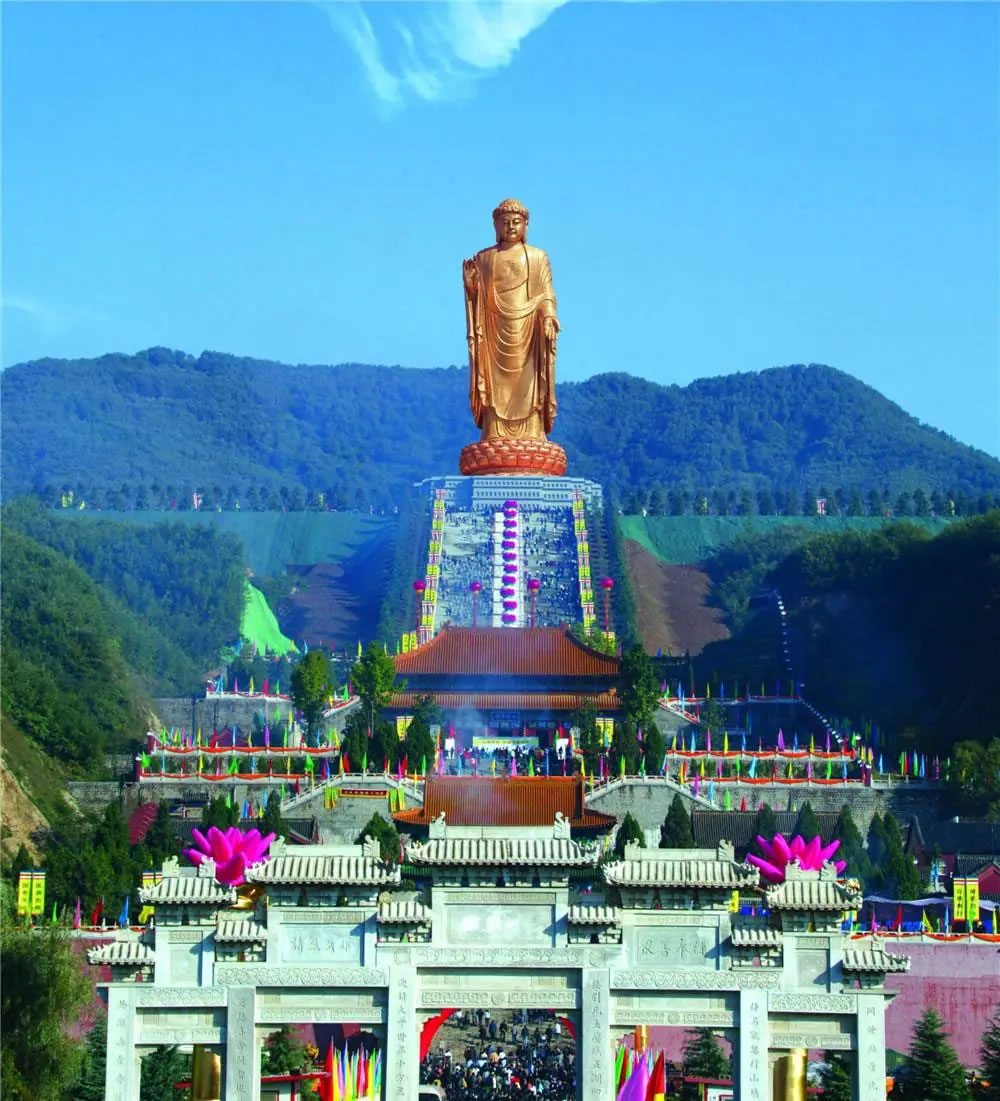 中原大佛景區(qū)位于河南省平頂山市魯山縣境內(nèi),地處伏牛山生態(tài)旅游黃金位置,景區(qū)規(guī)劃面積13.40平方千米。中原大佛景區(qū)由牌坊、佛泉寺、愿心臺(tái)、;鄞蟮馈⒍Y佛臺(tái)、中原大佛、吉祥鐘、佛教文化宮殿、文化碑廊等景點(diǎn)景觀組成。大佛總高208米,身高108米,蓮花座高20米,金剛座高25米,須彌座高55米,中原大佛整體佛像鑄造用銅3300噸,黃金108公斤,特殊鋼15000余噸,表面面積為11300平方米,通過焊接13300塊銅板而成。景區(qū)內(nèi)的天瑞吉祥金鐘凈重116噸,是載入《吉尼斯世界紀(jì)錄大全》的“世界最大外擊青銅鑄鐘”,世界佛光總會(huì)會(huì)長、臺(tái)灣佛光山開山宗長星云大師為大佛題寫“世界第一中原大佛”大字,大佛前還有有四季長流的沙河圣水,佛泉湯、佛泉寺、中原釋迦大佛、天瑞吉祥鐘等景觀。