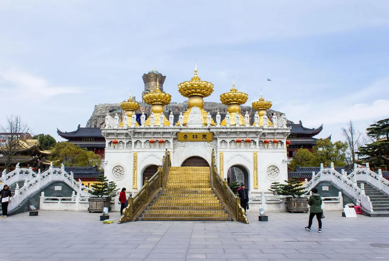 東林寺,位于上海市金山區(qū)朱涇鎮(zhèn)。其原名觀音堂,元至大元年(1308年),由僧侶妙因創(chuàng)建。元皇慶二年(1313年)改為東林禪寺。東林寺占地24.07畝,為浦南地區(qū)單體建筑面積最大的元、明、清建筑群,建筑風格獨特,寺廟主體建筑依著一座高大的仿假山建筑而建,形成山寺合一。寺廟的新建部分融合了現代設計元素,在保留傳統廟宇氣息的同時,展現出新穎獨特的景觀。尤其是寺廟中金碧輝煌的建筑和雕塑,展示出中國傳統工藝的精湛與華麗。分圓通寶殿、大雄寶殿、觀音閣、善財殿、千佛門、鐘樓、鼓樓、金愿橋、五佛冠、金蓮池(景泰藍善財童子)等景點。