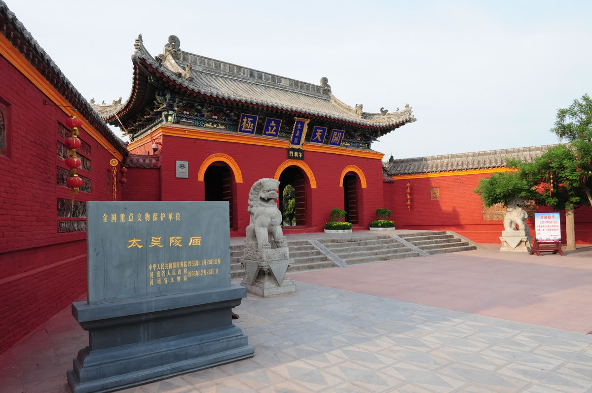 太昊陵廟,位于河南省周口市淮陽(yáng)區(qū)中華太昊伏羲始祖圣地旅游區(qū)內(nèi),始建于明正統(tǒng)年間,是為紀(jì)念三皇之首太昊伏羲氏而修建的陵廟合一的大型古建筑群,是中國(guó)十八大名陵之一。太昊陵廟占地面積875畝,南北長(zhǎng)750米,分外城、內(nèi)城、紫禁城三道皇城。從南至北的中軸線上依次為渡善橋、午朝門、道儀門、先天門、太極門、統(tǒng)天殿、顯仁殿、太始門、八卦壇、太昊陵墓、蓍草園。太昊陵廟以先天八卦數(shù)理興建,是中國(guó)帝王陵廟中大規(guī)模宮殿式古建筑群之孤例。