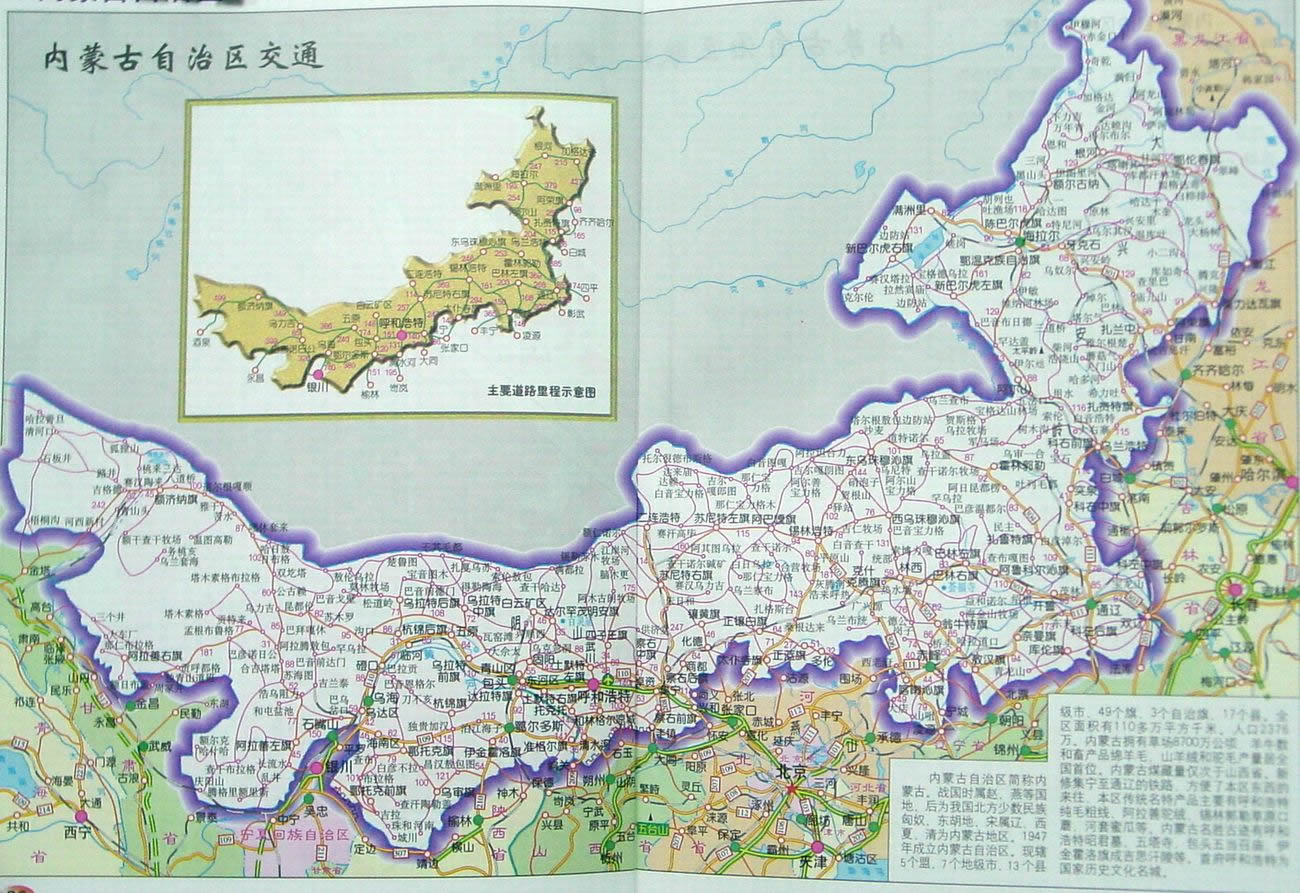 內蒙古已形成了以首府呼和浩特市為中心的鐵路、公路、民航組成的綜合交通運輸網絡。主要鐵路干線有京包線、京通線、包蘭線、濱洲線、集二線;由于該區(qū)城市少而分散,地勢平坦,因此適宜發(fā)展公路交通。公路網以國道為骨干,干支線相結合,溝通各盟市旗縣的交通網絡.....