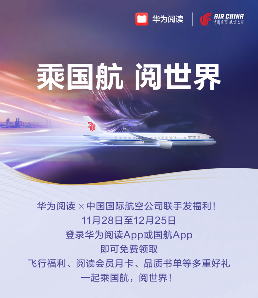 為了豐富旅客的飛行時(shí)光,近日華為閱讀與中國(guó)國(guó)際航空公司攜手,正式啟動(dòng)了“乘國(guó)航 閱世界”國(guó)航伴讀計(jì)劃,該計(jì)劃通過整合華為閱讀的豐富資源與國(guó)航的全球航線網(wǎng)絡(luò),為用戶打造一個(gè)旅行中的高品質(zhì)閱讀空間。參與此次活動(dòng)的用戶將可免費(fèi)領(lǐng)取3重好禮!包含了國(guó)航用戶多重福利、30天華為閱讀會(huì)員、精選國(guó)航伴讀書單,帶旅客悅享旅途的美好。