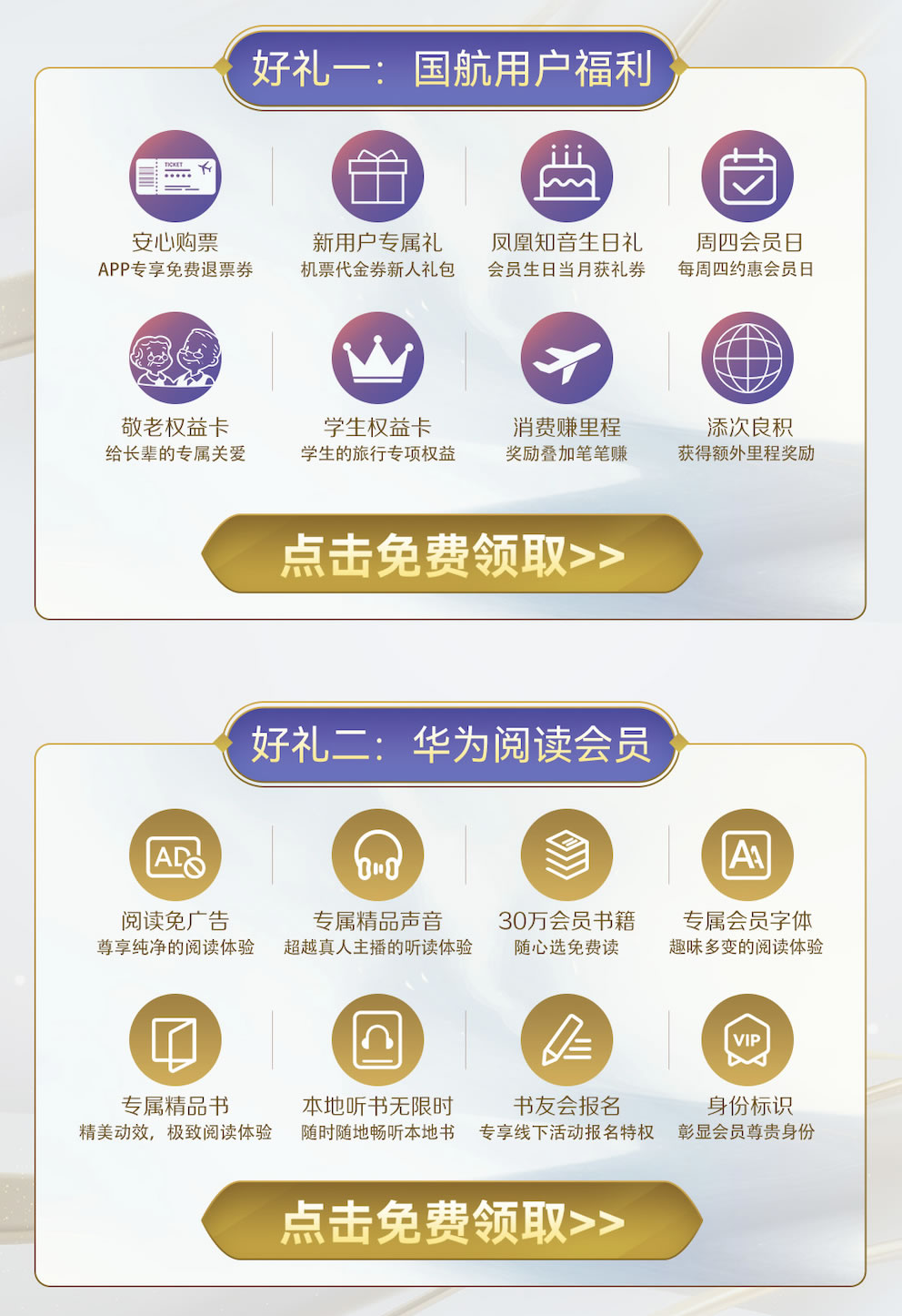 本次活動(dòng)中,國(guó)航為用戶提供了退票券、生日禮、敬老權(quán)益卡、學(xué)生權(quán)益、新人專屬禮券等一系列大禮包。華為閱讀則為國(guó)航的用戶提供了30天閱讀會(huì)員的專屬福利!領(lǐng)取后可以享受超百家知名出版社30萬冊(cè)版權(quán)會(huì)員書籍免費(fèi)讀,不僅可以免費(fèi)使用專屬會(huì)員字體閱讀,還能獲得免廣告的純凈體驗(yàn)。同時(shí),喜愛聽書的用戶還可以使用專屬的精品聲音聽書,本地聽書無限時(shí),加入書架的書籍還內(nèi)置了專屬精品聲音,給用戶帶來超越真人主播的聽讀體驗(yàn)。華為閱讀還會(huì)定期組織線下書友會(huì),領(lǐng)取會(huì)員后可專享書友會(huì)優(yōu)先報(bào)名特權(quán)!